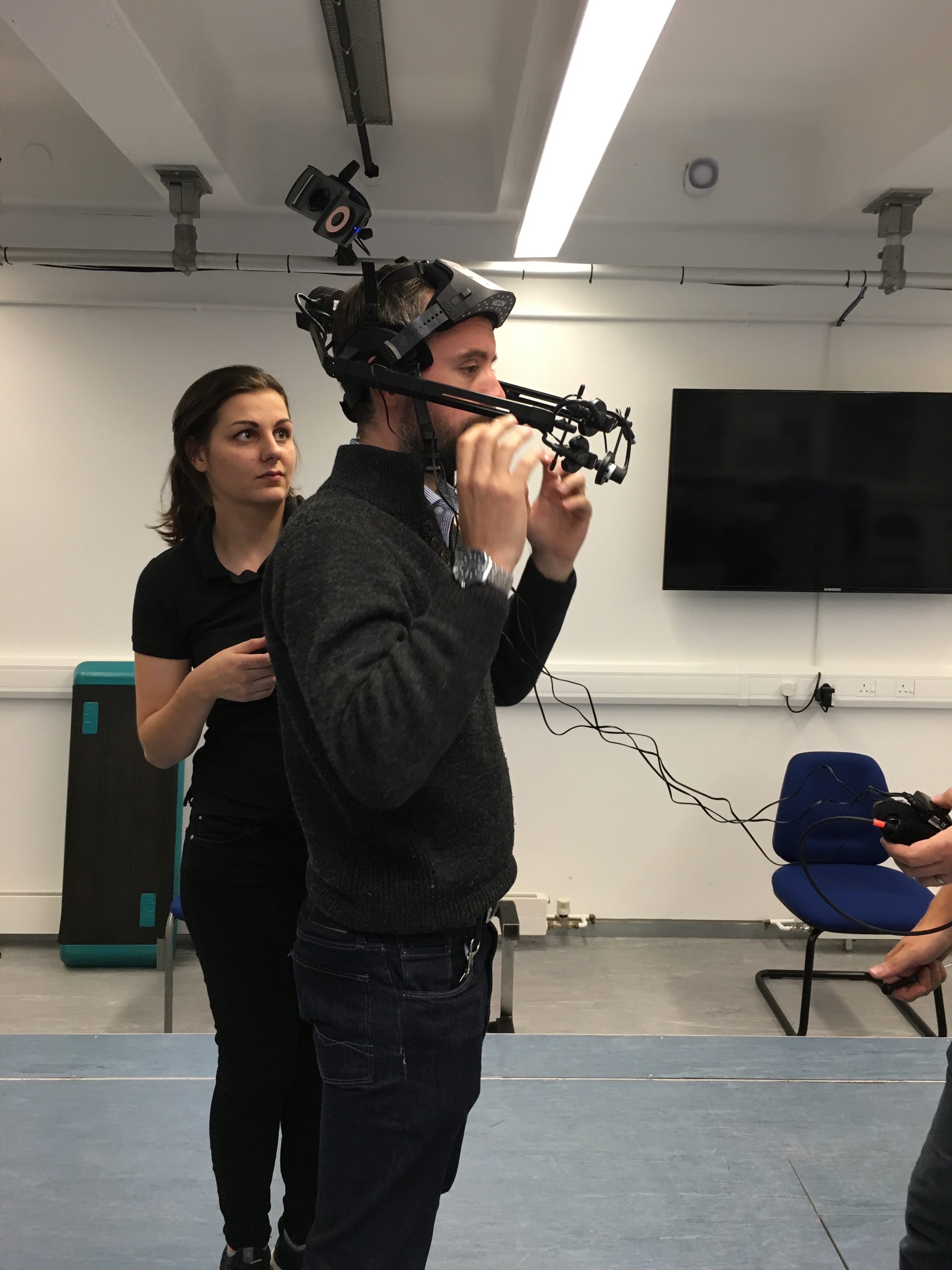 Matt Oughton (EMEA Sales Manager), Dami Phillips (Technical Sales Engineer) and Katie Davies (Support Engineer) arrived at the motion capture lab with two boxes of kit which we were keen to unpack and try out as soon as possible. First was their brand new Cara Lite system, recently announced at SIGGRAPH 2017. This two-camera based system can be used markerless with analysis software to model the movement of the wearer’s face once recorded. The system certainly felt lighter than the previous Cara system, and this version is designed to be customisable to different client needs.