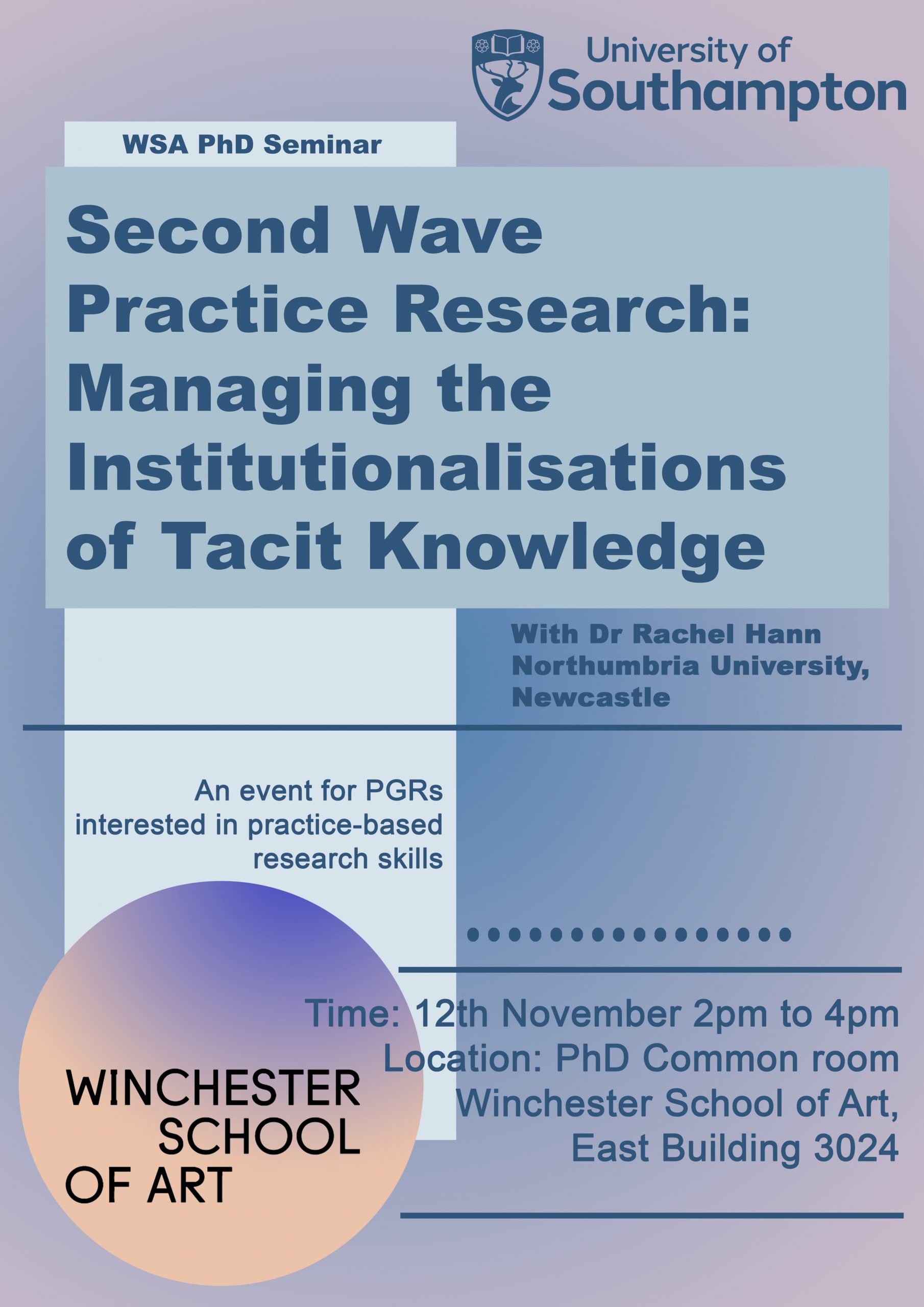 We’ll be continuing our regular Winchester School of Art PhD Seminar Series, which will generally run from 2-4pm on Wednesdays, in person (PGR Rooms at WSA) and on MS Teams. The series consists of (guest) speakers, workshops, trainings, and other research- and practice-led events.