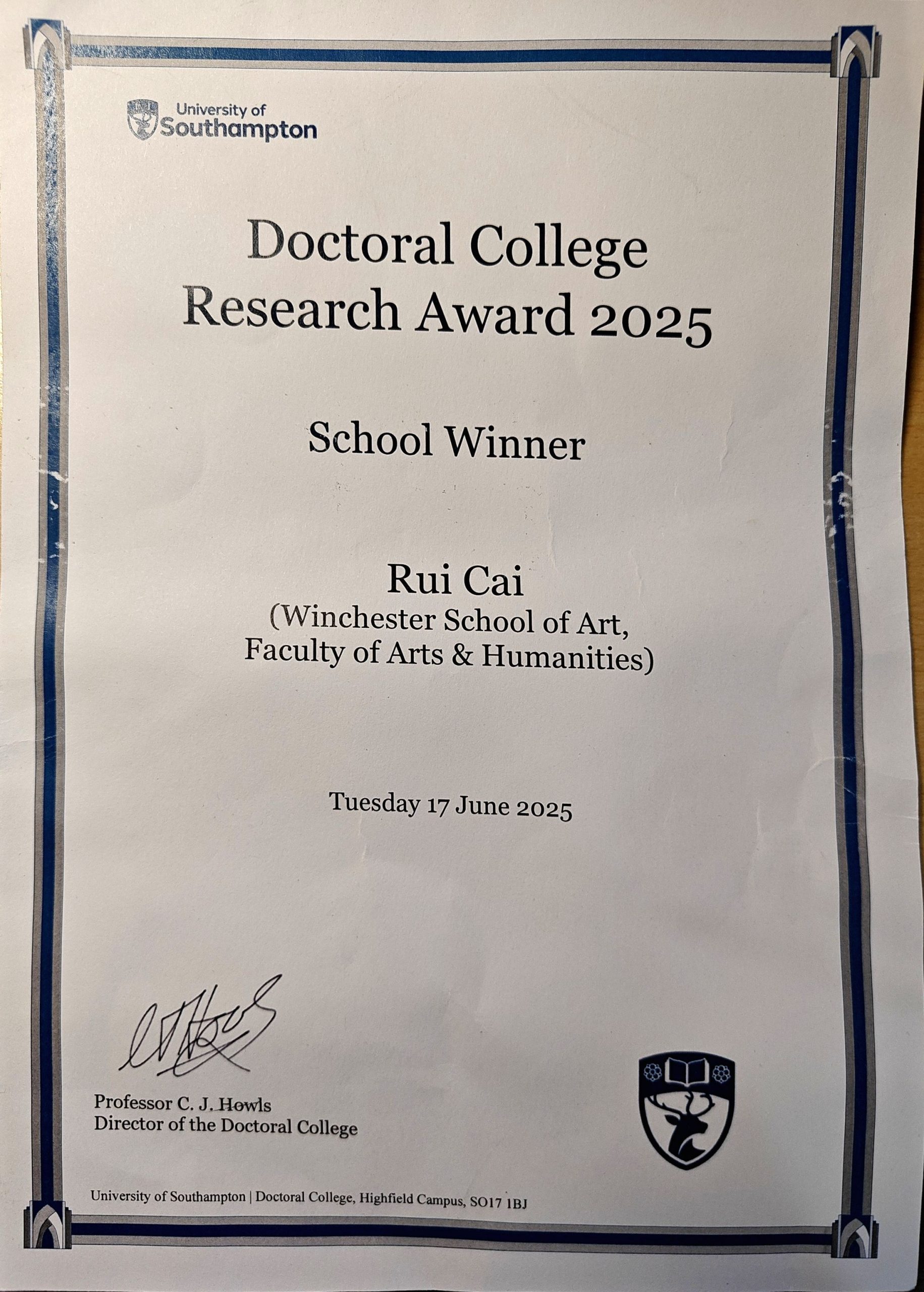 WSA PhD researcher Rui Cai has been awarded the School Winner of the Doctoral College Research Award 2025, receiving a Ā£200 prize in recognition of his outstanding contribution to the research environment. He was nominated for his active engagement in managing the shared studio space used by practice-based PhD researchers and for fostering a strong sense of community solidarity among all WSA PGR researchers. This award celebrates the exceptional impact of doctoral researchers on their research group, school, faculty, or the wider University research strategy.Ā